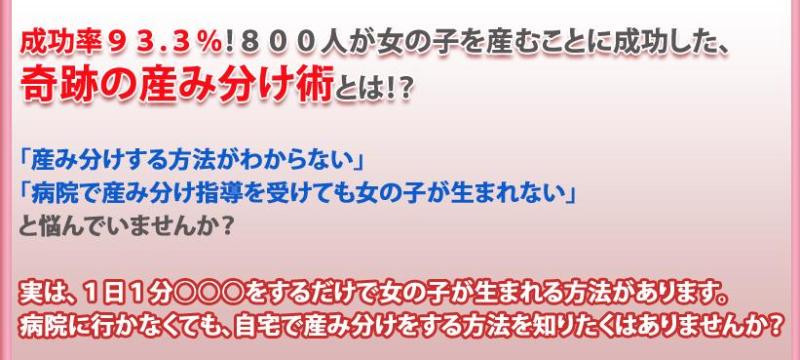 あなたも●念願の女の子が授かりやすくなります。●40代以上の高齢の方でも産み分けしやすくなります。しかも、自宅で時間とお金をかける事なくあなた自身の力でです!奇跡の女の子産み分け術
